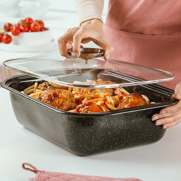 - Il rivestimento antiaderente è conforme al regolamento per i materiali che possono entrare in contatto con il cibo.